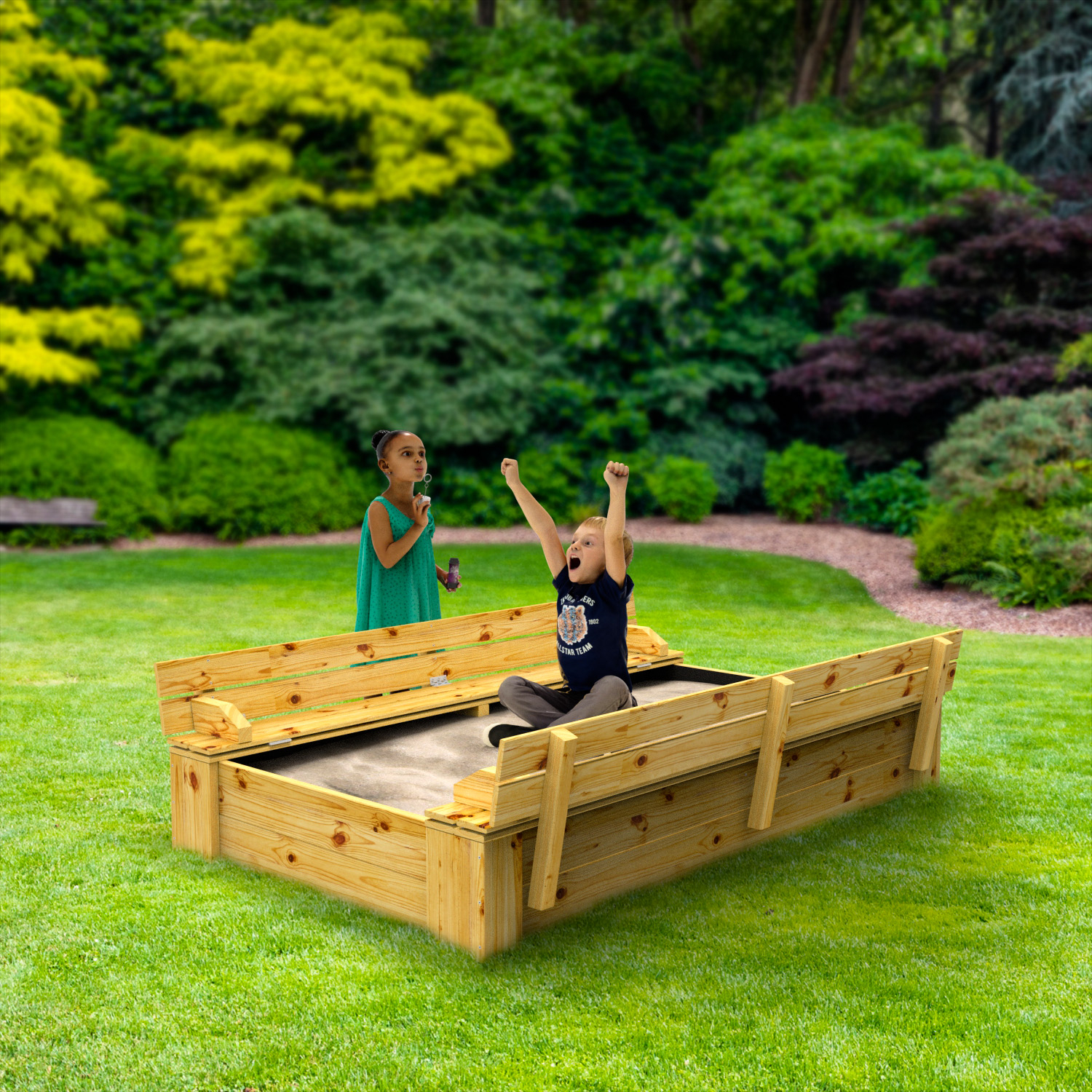 De Snuggly Sandhill is voorzien van een zit / Klapdeksel, waarbij zelfs de kleinste kinderen het deksel van deze zandbak zelfstandig kunnen openen of sluiten. Als het zandbakdeksel gesloten is, is er een veiligheidsmarge tussen beide deksel, zodat de kinderen hun vingers niet kunnen klemmen. Er bestaat ook een optie om extra handvaten in een mooie kleur te monteren, zodat je het deksel van de zandbak nog makkelijker kan openen of sluiten.