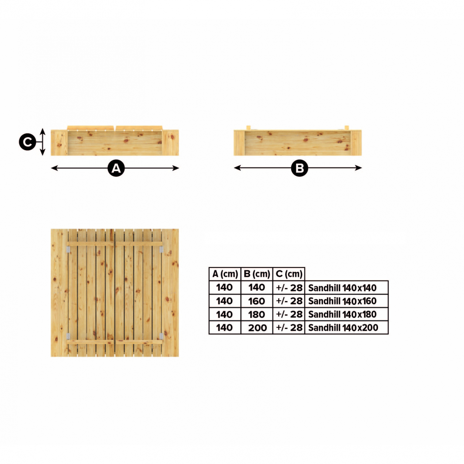 De Snuggly Sandhill is verkrijgbaar in verschillende afmetingen, met breedte van 120, 140 & 160 cm. Daarnaast zijn er ook verschillende diepte afhankelijk van het type. Hieronder een voorbeeld van de Snuggly Sandhill 140 reeks, herkenbaar aan de leuning met 3 opwaartse planken in de zit modus.