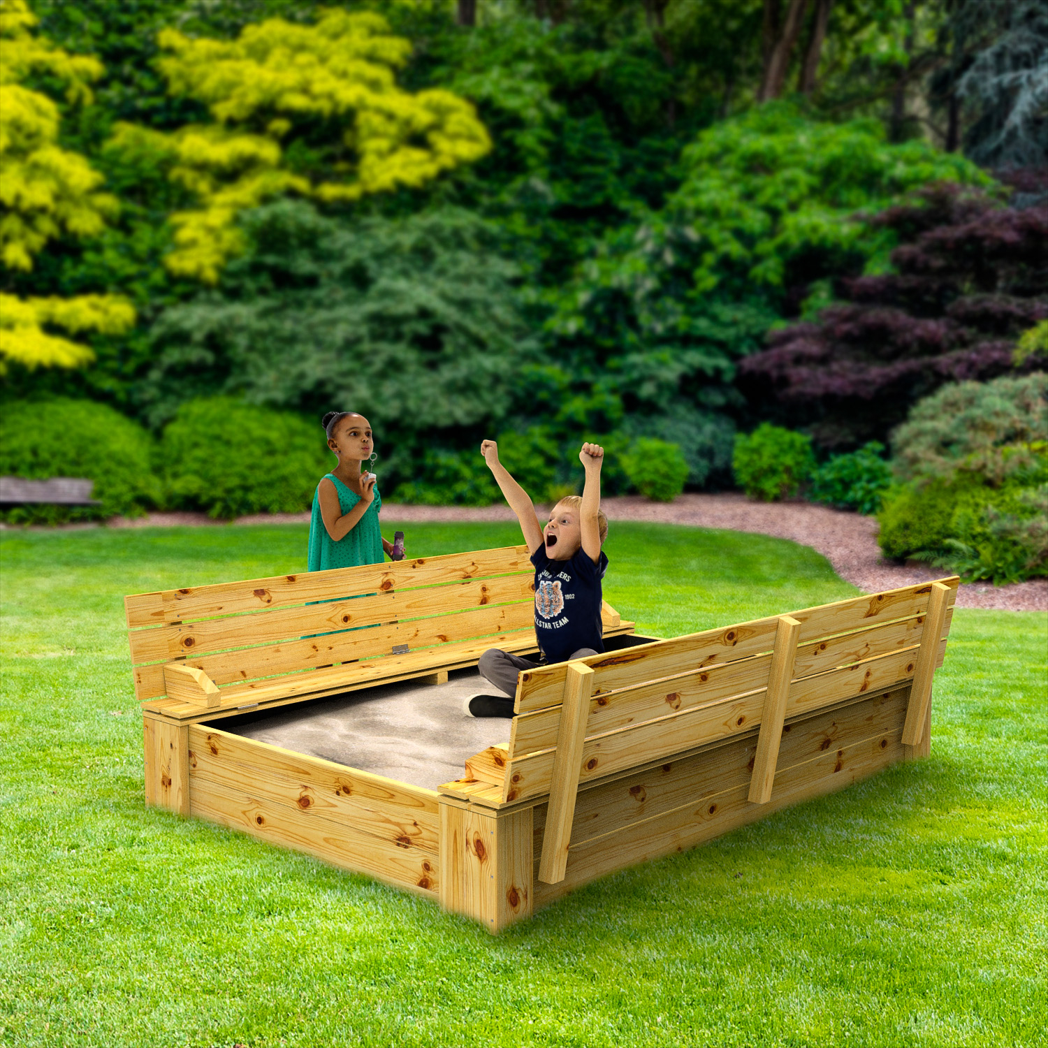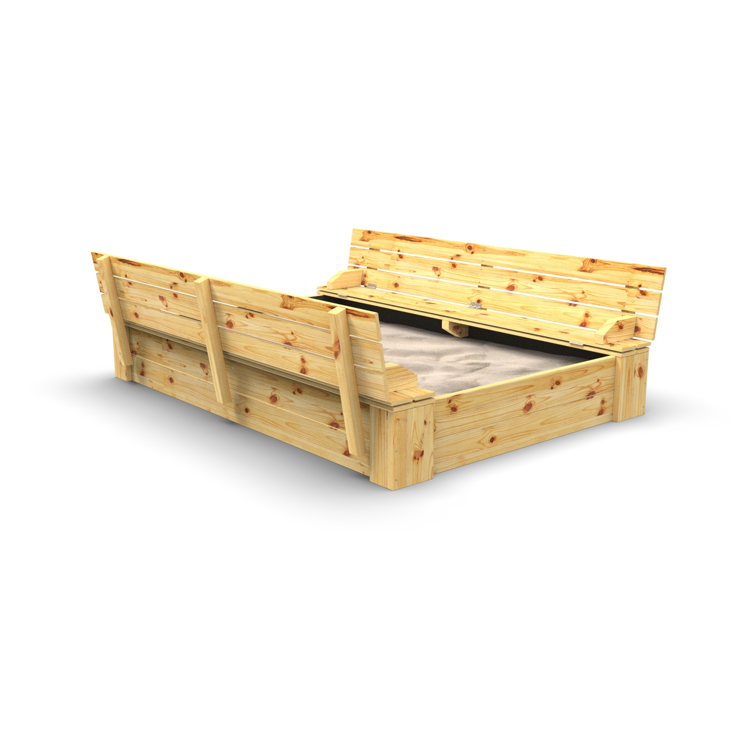 De Snuggly Sandhill is voorzien van een zit / Klapdeksel, waarbij zelfs de kleinste kinderen het deksel van deze zandbak zelfstandig kunnen openen of sluiten. Als het zandbakdeksel gesloten is, is er een veiligheidsmarge tussen beide deksel, zodat de kinderen hun vingers niet kunnen klemmen. Er bestaat ook een optie om extra handvaten in een mooie kleur te monteren, zodat je het deksel van de zandbak nog makkelijker kan openen of sluiten.