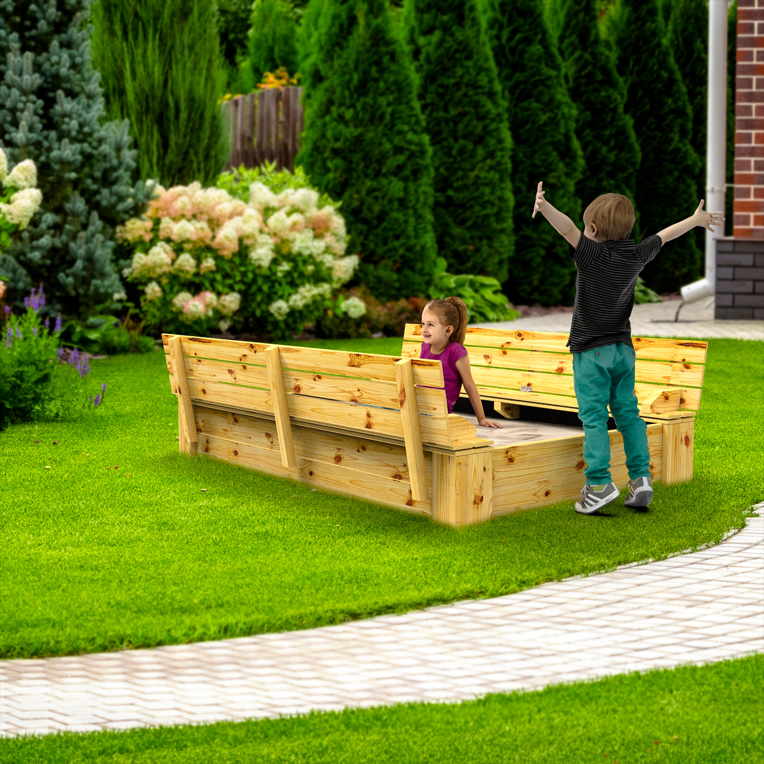 De zandbak is niet voorzien van een bodem, zandbak accessoires of speelzand !
