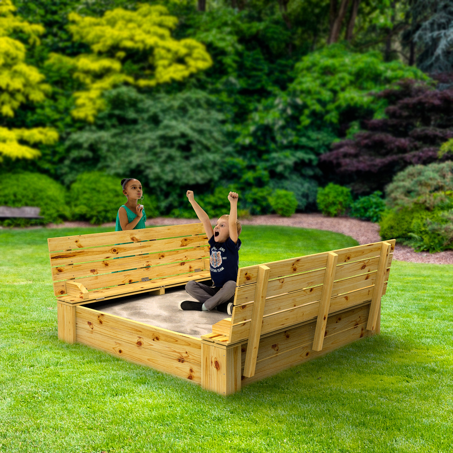De Snuggly Sandhill is voorzien van een zit / Klapdeksel, waarbij zelfs de kleinste kinderen het deksel van deze zandbak zelfstandig kunnen openen of sluiten. Als het zandbakdeksel gesloten is, is er een veiligheidsmarge tussen beide deksel, zodat de kinderen hun vingers niet kunnen klemmen. Er bestaat ook een optie om extra handvaten in een mooie kleur te monteren, zodat je het deksel van de zandbak nog makkelijker kan openen of sluiten.
