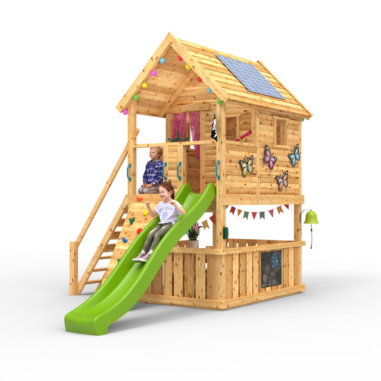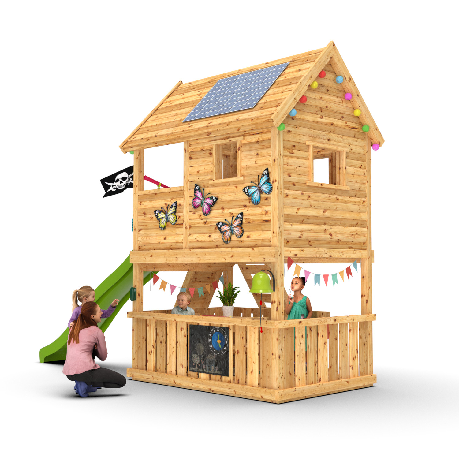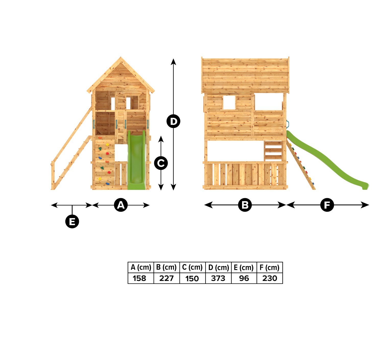 Dit houten speeltoestel voor de tuin heeft een afmeting van 158 cm breed x 227 cm diep en biedt duidelijk meer volume en bruikbare ruimte. De Boisy Champion voelt aan als een echt huisje op hoogte, eerder dan een klassieke speeltoren