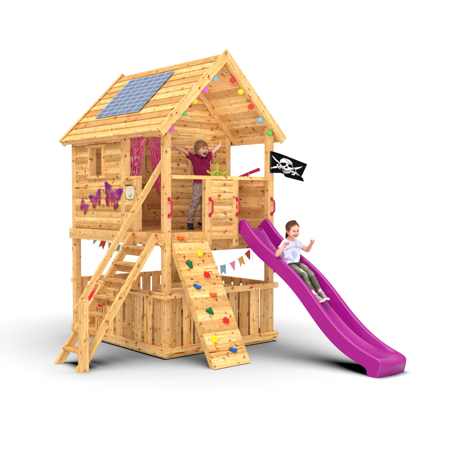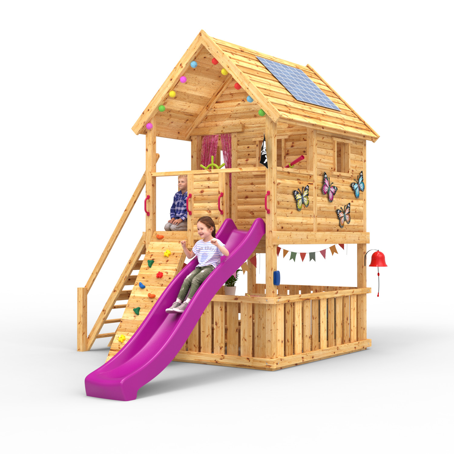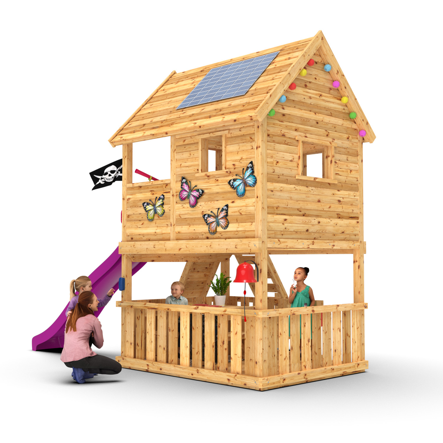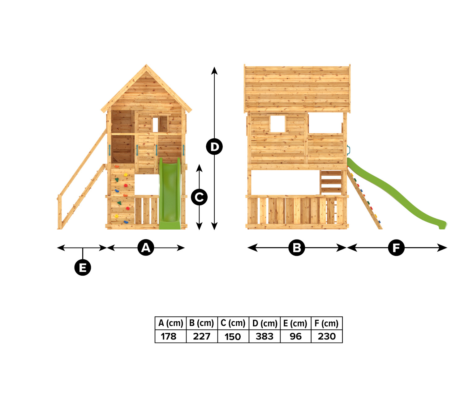 Dit houten speeltoestel voor de tuin heeft een afmeting van 178 cm breed x 227 cm diep en biedt duidelijk meer volume en bruikbare ruimte. De Boisy Champion voelt aan als een echt huisje op hoogte, eerder dan een klassieke speeltoren