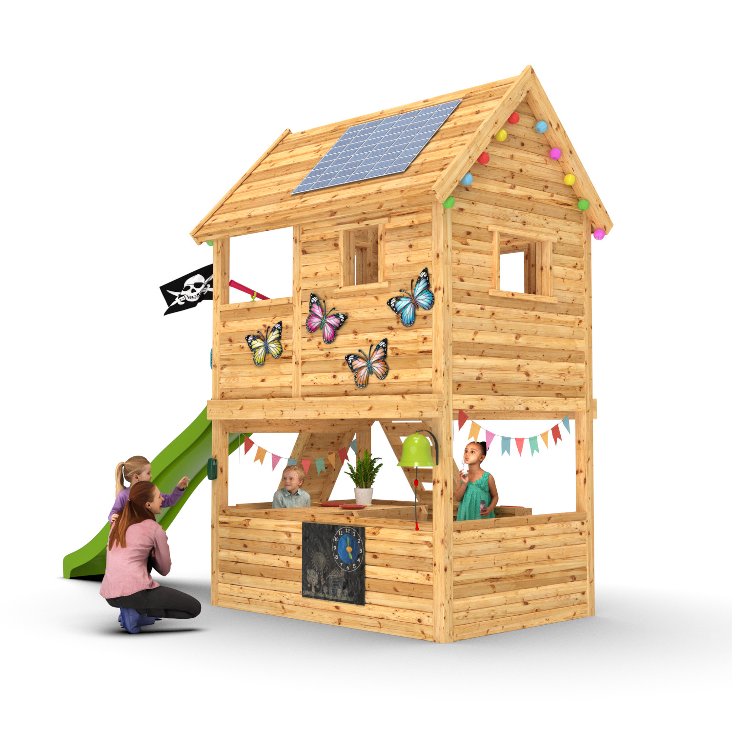 Dit houten speeltoestel voor de tuin heeft een afmeting van 158 cm breed x 227 cm diep en biedt een ruime en comfortabele speelindeling. De Champion Plus voelt aan als een echt huisje op hoogte, met onderaan een extra afgesloten speelruimte. Bovenaan: